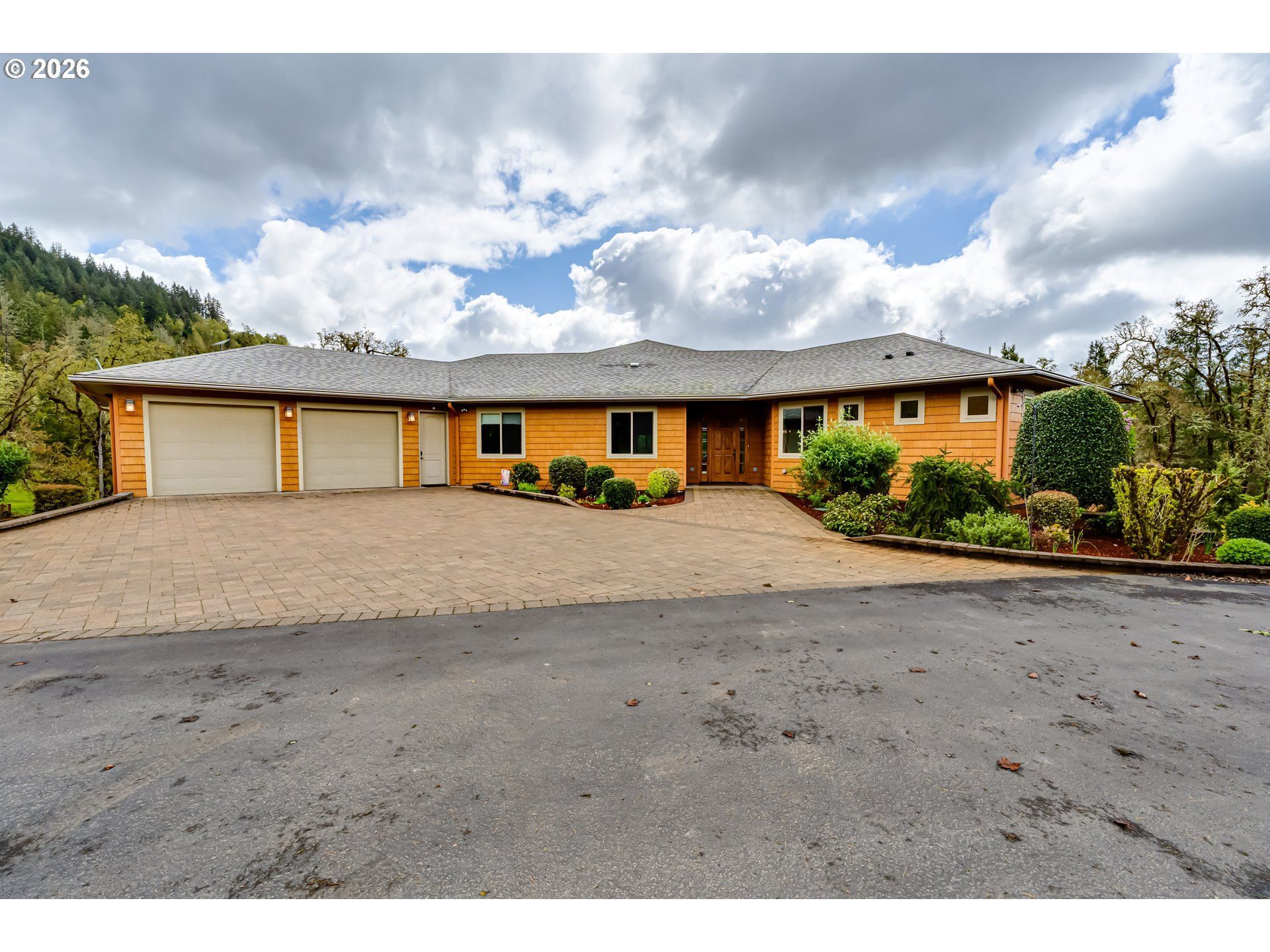 Secluded 13.29-acre estate spanning two tax lots offers privacy, beauty, and functionality. Gently rolling, usable land features mature oak trees, an orchard with cherry, apple, and peach trees, and two seasonal ponds. Meandering pathways, bridges, and benches create a park-like setting for relaxation and exploration.Outdoor living includes expansive low-maintenance composite decks for entertaining. The property offers upper and lower true two-car garages plus a detached garage for larger equipment. Ample space for tools, hobbies, vehicles, and storage is designed for ease of upkeep.The custom-built 5,417 sq ft home centers around a 36' x 14' indoor pool heated by a geothermal HVAC system, with an indoor hot tub framed by expansive windows for natural light and views. Features include an Xtrordinair fireplace with heat exchange, a gourmet kitchen with premium stainless steel appliances, and wood flooring throughout.The main level includes a primary suite with an extra-large walk-in closet and pass-through laundry, dedicated office spaces, vaulted ceilings, and oversized doorways. The lower level adds a workout room, second laundry with dog washing station, and a woodworking or hobby space suitable for multi-generational living.The pool room opens to a patio and turf yard with a putting green, raised garden beds, and mature landscaping.Additional features include two geothermal systems (home and pool), new furnace (2025), composite roof with leaf guard gutters, cement tile exterior, and a backup generator with a 250-gallon propane tank.This property combines usable acreage, infrastructure, and comfortable living for everyday use and long-term enjoyment.